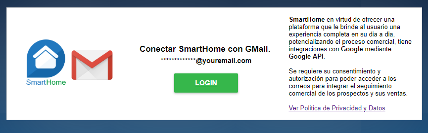 SMART-HOME en virtud de ofrecer una plataforma que le brinde al usuario una experiencia completa en su dia a dia, potencializando el proceso comercial, tiene integraciones con Google, mediante Google API, para autenticar al usuario y con su concentimiento, tener la autorización para poder acceder a los correos para integrar el seguimiento comercial de los prospectos y sus ventas. Esta lectura no sera efectuada por humanos. La lectura se hará solo en el momento que el usuario de la cuenta de correo lo solicite directamente desde la plataforma y se leerán los remitentes del correo para compararlos con los correos de los clientes en la plataforma de SmartHome.